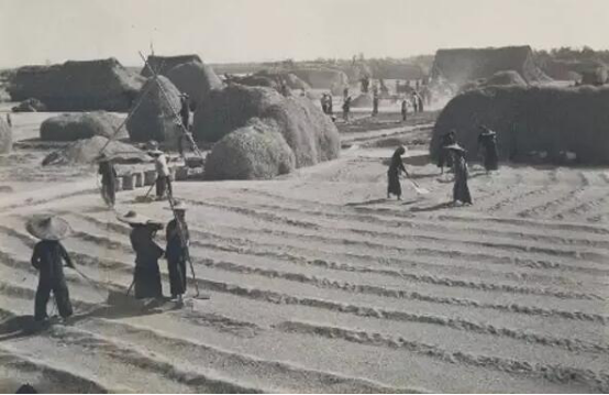 50年代,人們熱鬧的在一起曬稻谷。
